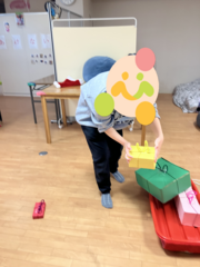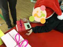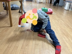 プレゼントのリボンに引っかけてプレゼントを拾ったり、しゃがむ動作を取り入れながら集めていきました。