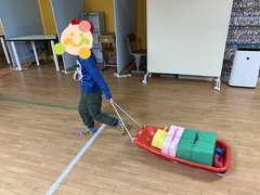 (2)プレゼント運び…集めたプレゼントをそりに乗せて運びます。そりからプレゼントが落ちないように、