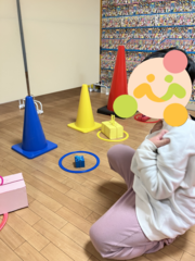 ➀プレゼント拾い…ここでは体のパーツを知る・柔軟性や体幹を高めることを目的とし、くじで引いた体の部位にS字フックを付け、